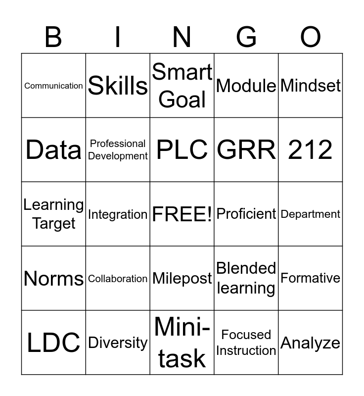 This bingo card has a free space and 24 words: Collaboration, Diversity, PLC, LDC, Mindset, Communication, Data, Skills, Proficient, Milepost, GRR, Learning Target, Blended learning, Formative, Professional Development, Focused Instruction, Department, Smart Goal, 212, Integration, Analyze, Norms, Module and Mini-task.