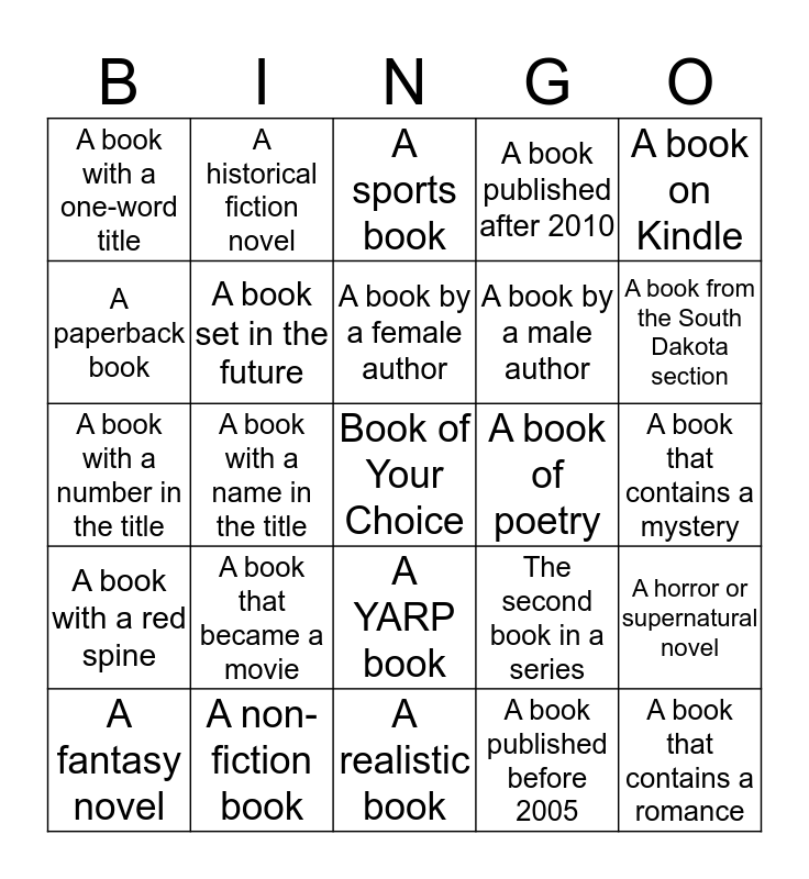 This bingo card has a free space and 24 words: A book that became a movie, A non-fiction book, A book by a female author, A fantasy novel, A book on Kindle, A book with a one-word title, A paperback book, A historical fiction novel, A book of poetry, A YARP book, A book by a male author, A book with a number in the title, The second book in a series, A horror or supernatural novel, A book set in the future, A book published before 2005, A book that contains a mystery, A sports book, A book from the South Dakota section, A book with a name in the title, A book that contains a romance, A book with a red spine, A book published after 2010 and A realistic book.