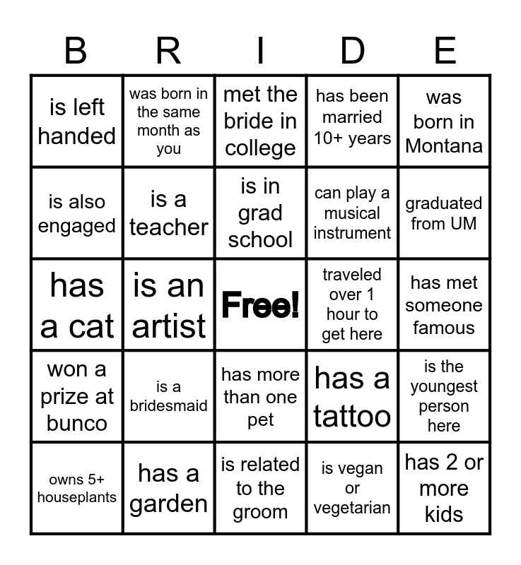 This bingo card has a free space and 24 words: is a bridesmaid, has a garden, is in grad school, owns 5+ houseplants, was born in Montana, is left handed, is also engaged, was born in the same month as you, traveled over 1 hour to get here, has more than one pet, can play a musical instrument, has a cat, has a tattoo, is the youngest person here, is a teacher, is vegan or vegetarian, has met someone famous, met the bride in college, graduated from UM, is an artist, has 2 or more kids, won a prize at bunco, has been married 10+ years and is related to the groom.