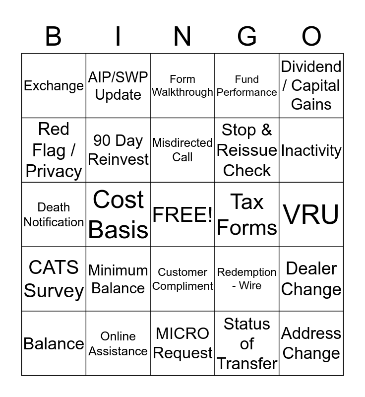 This bingo card has a free space and 29 words: Balance, RMD, Cost Basis, Redemption - AOR, Exchange, Form Walkthrough, 90 Day Reinvest, Minimum Balance, Tax Forms, Online Assistance, VRU, Address Change, MICRO Request, Status of Transfer, Inactivity, Certificates, Customer Compliment, CATS Survey, Dividend / Capital Gains, Death Notification, Redemption - Wire, On Demand Purchase, Stop & Reissue Check, Red Flag / Privacy, Fund Performance, AIP/SWP Update, Dealer Change, Misdirected Call and Redemption -ACH.