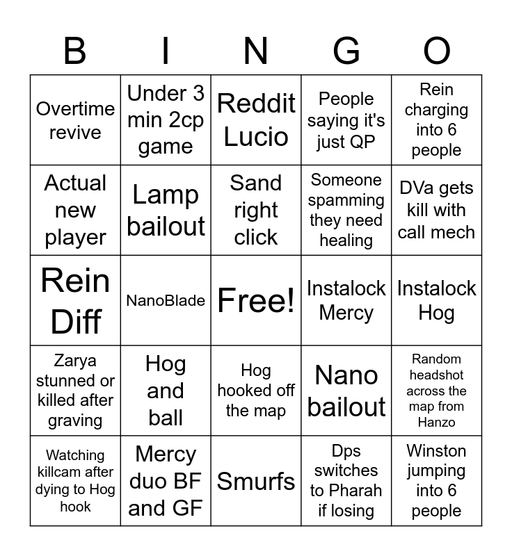 This bingo card has a free space and 24 words: Hog and ball, Mercy duo BF and GF, Sand right click, Watching killcam after dying to Hog hook, Rein charging into 6 people, Overtime revive, Actual new player, Under 3 min 2cp game, Instalock Mercy, Hog hooked off the map, Someone spamming they need healing, Rein Diff, Nano bailout, Random headshot across the map from Hanzo, Lamp bailout, Dps switches to Pharah if losing, Instalock Hog, Reddit Lucio, DVa gets kill with call mech, NanoBlade, Winston jumping into 6 people, Zarya stunned or killed after graving, People saying it's just QP and Smurfs.