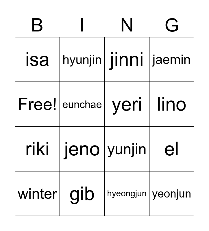 This bingo card has 16 words: gib, el, jinni, isa, riki, hyunjin, yunjin, hyeongjun, Free!, eunchae, winter, jaemin, jeno, lino, yeri and yeonjun.