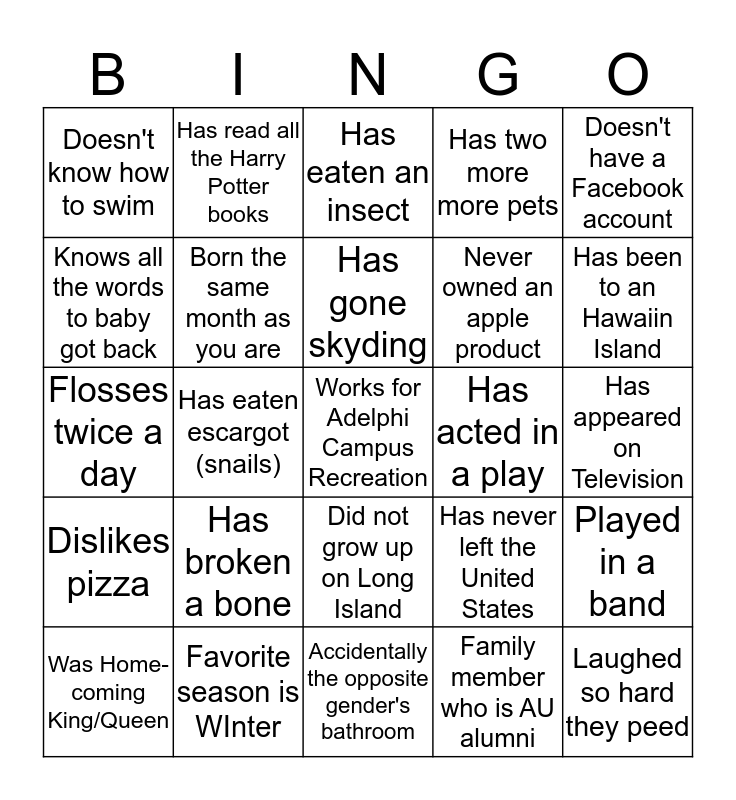This bingo card has a free space and 24 words: Has broken a bone, Favorite season is WInter, Has gone skyding, Was Home-coming King/Queen, Doesn't have a Facebook account, Doesn't know how to swim, Knows all the words to baby got back, Has read all the Harry Potter books, Has acted in a play, Did not grow up on Long Island, Never owned an apple product, Flosses twice a day, Has never left the United States, Played in a band, Born the same month as you are, Family member who is AU alumni, Has appeared on Television, Has eaten an insect, Has been to an Hawaiin Island, Has eaten escargot (snails), Laughed so hard they peed, Dislikes pizza, Has two more more pets and Accidentally the opposite gender's bathroom.