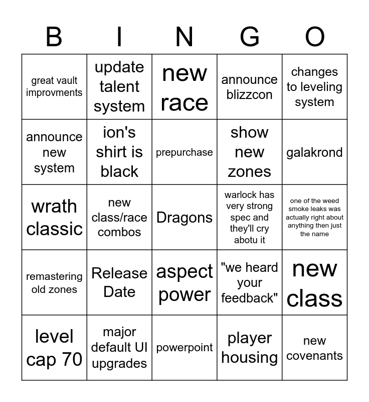 This bingo card has a free space and 24 words: Release Date, major default UI upgrades, prepurchase, level cap 70, changes to leveling system, great vault improvments, announce new system, update talent system, warlock has very strong spec and they'll cry abotu it, aspect power, show new zones, wrath classic, "we heard your feedback", new class, ion's shirt is black, player housing, one of the weed smoke leaks was actually right about anything then just the name, new race, galakrond, new class/race combos, new covenants, remastering old zones, announce blizzcon and powerpoint.