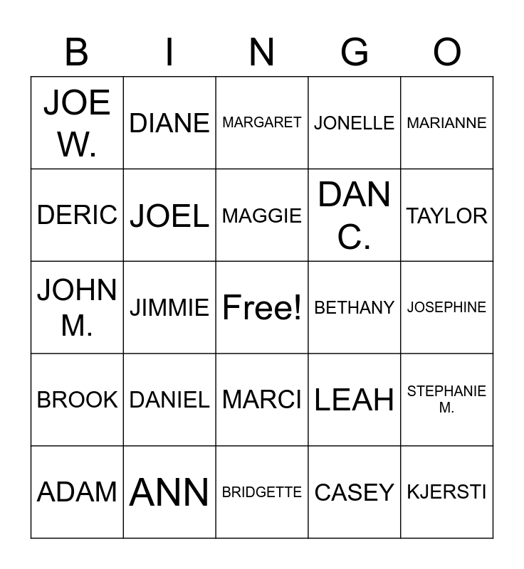 This bingo card has a free space and 42 words: JUSTIN, MAGGIE, CYNTHIA, DANIEL, CASEY, STEPHANIE M., KJERSTI, CLAIRE, MARGARET, MARCI, JOSEPHINE, TAYLOR, JIMMIE, MARIANNE, DAVID, LEAH, DR. DICKMANN, JOHN M., REBECCA, DIANE, DERIC, RANDY, ARMENTHA, JOE W., JON P., JANAE, DAN C., MATT H., JODI, STEPH G., LARISA, BROOK, JOEL, BRIDGETTE, CASSIE, ADAM, ANN, BETHANY, ALYSSA, MATT O., JONELLE and JAMIE.