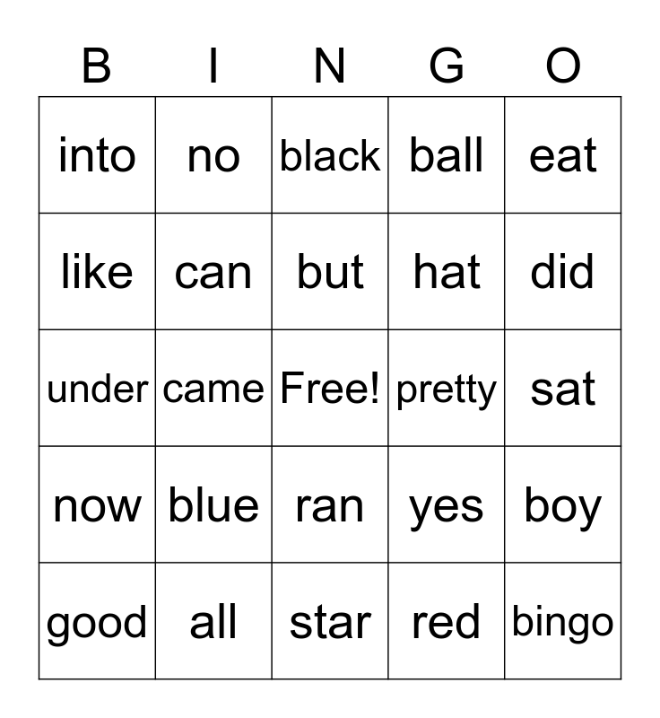 This bingo card has a free space and 24 words: blue, all, but, good, eat, into, like, no, pretty, ran, hat, under, yes, boy, can, red, sat, black, did, came, bingo, now, ball and star.