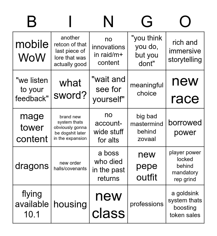This bingo card has 25 words: new order halls/covenants, new class, "wait and see for yourself", flying available 10.1, rich and immersive storytelling, mobile WoW, "we listen to your feedback", another retcon of that last piece of lore that was actually good, big bad mastermind behind zovaal, a boss who died in the past returns, meaningful choice, mage tower content, new pepe outfit, player power locked behind mandatory rep grind, what sword?, a goldsink system thats boosting token sales, borrowed power, no innovations in raid/m+ content, new race, brand new system thats obviously gonna be dogshit later in the expansion, no account-wide stuff for alts, housing, dragons, "you think you do, but you dont" and professions.