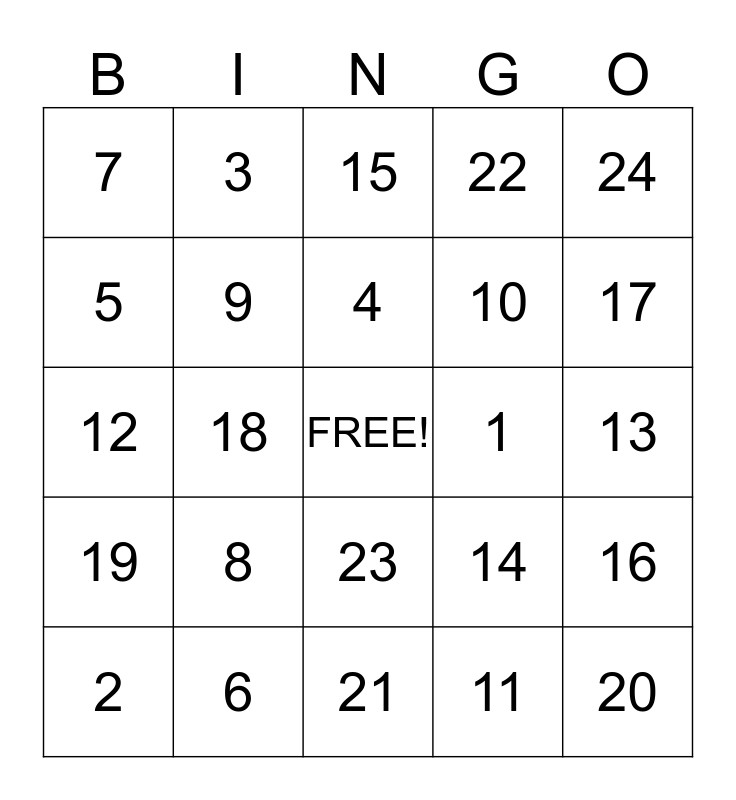 This bingo card has a free space and 24 words: 8, 6, 4, 2, 24, 7, 5, 3, 1, 23, 10, 12, 14, 16, 9, 11, 13, 15, 17, 18, 20, 19, 22 and 21.