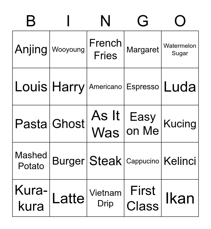 This bingo card has a free space and 24 words: Burger, Latte, Americano, Kura-kura, Watermelon Sugar, Anjing, Louis, Wooyoung, Easy on Me, Steak, Espresso, Pasta, Cappucino, Kelinci, Harry, First Class, Kucing, French Fries, Luda, Ghost, Ikan, Mashed Potato, Margaret and Vietnam Drip.
