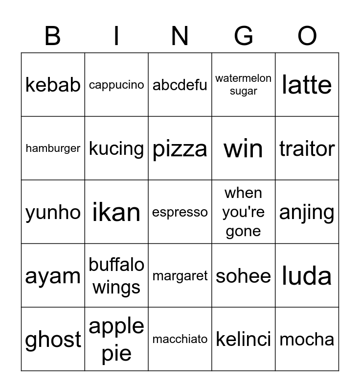 This bingo card has a free space and 24 words: buffalo wings, apple pie, pizza, ghost, latte, kebab, hamburger, cappucino, when you're gone, margaret, win, yunho, sohee, luda, kucing, kelinci, anjing, abcdefu, traitor, ikan, mocha, ayam, watermelon sugar and macchiato.