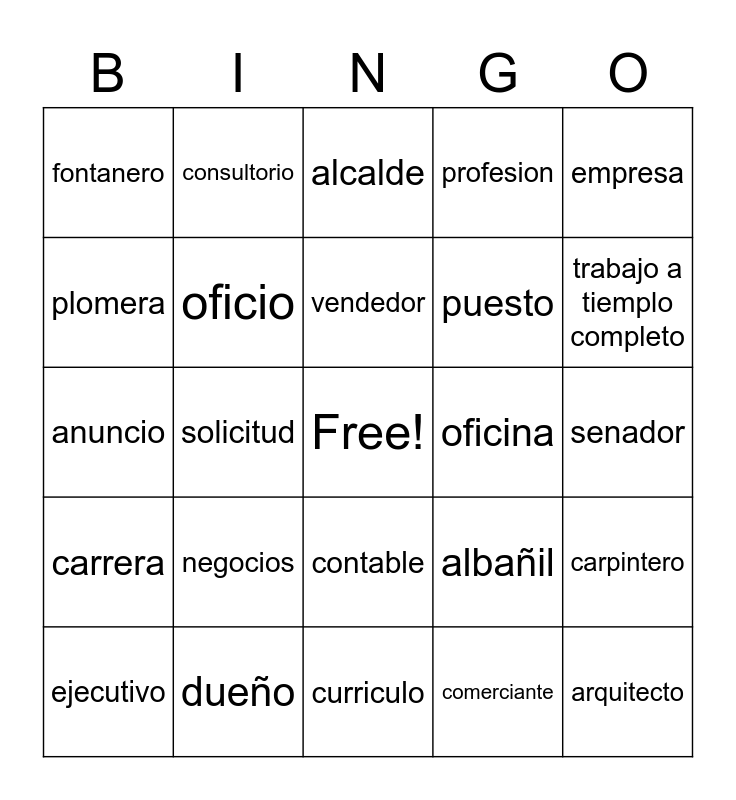 This bingo card has a free space and 24 words: negocios, dueño, vendedor, ejecutivo, empresa, fontanero, plomera, consultorio, oficina, contable, puesto, anuncio, albañil, carpintero, oficio, comerciante, senador, alcalde, trabajo a tiemplo completo, solicitud, arquitecto, carrera, profesion and curriculo.