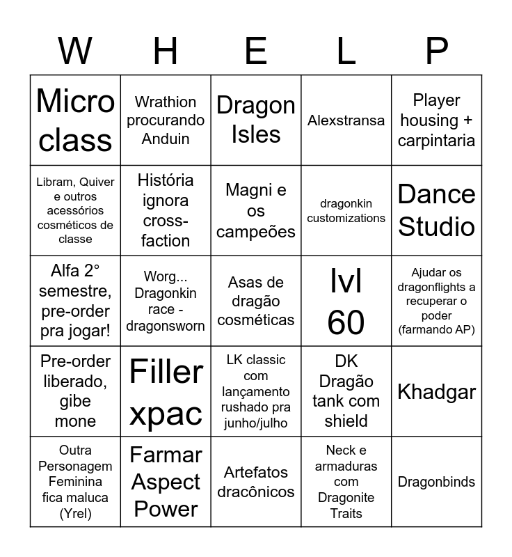 This bingo card has a free space and 29 words: Outra Personagem Feminina fica maluca (Yrel), Dragon covenants, Worg... Dragonkin race - dragonsworn, Evoker class, Micro class, Dragon Isles, História ignora cross-faction, Filler xpac, lvl 60, Farmar Aspect Power, Ajudar os dragonflights a recuperar o poder (farmando AP), Dragonbinds, Artefatos dracônicos, Neck e armaduras com Dragonite Traits, Dance Studio, LK classic Deluxe com um bicho que não era mount virando mount, LK classic com lançamento rushado pra junho/julho, Pre-order liberado, gibe mone, Player housing + carpintaria, Alfa 2° semestre, pre-order pra jogar!, DK Dragão tank com shield, Galakrond filler boss, dragonkin customizations, Libram, Quiver e outros acessórios cosméticos de classe, Alexstransa, Wrathion procurando Anduin, Khadgar, Magni e os campeões and Green Jesus.