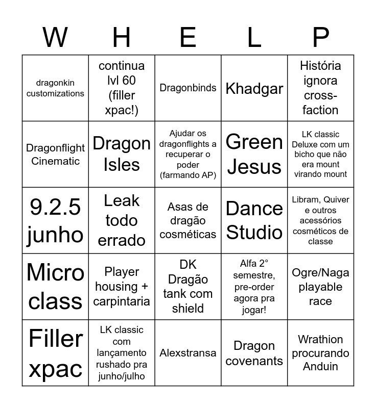 This bingo card has a free space and 34 words: Outra Personagem Feminina fica maluca (Yrel), Dragon covenants, Worg... Dragonkin race - dragonsworn, Evoker class, Micro class, Dragon Isles, História ignora cross-faction, Filler xpac, continua lvl 60 (filler xpac!), Farmar Aspect Power, Ajudar os dragonflights a recuperar o poder (farmando AP), Dragonbinds, Artefatos dracônicos, Neck e armaduras com Dragonite Traits, Dance Studio, LK classic Deluxe com um bicho que não era mount virando mount, LK classic com lançamento rushado pra junho/julho, 9.2.5 junho, Player housing + carpintaria, Alfa 2° semestre, pre-order agora pra jogar!, DK Dragão tank com shield, Galakrond filler boss, dragonkin customizations, Libram, Quiver e outros acessórios cosméticos de classe, Alexstransa, Wrathion procurando Anduin, Khadgar, Magni e os campeões, Green Jesus, Dragonflight Cinematic, tier crafting e outras melhorias jogadas fora, Leak todo errado, Ogre/Naga playable race and Ninguém ainda vai saber o que o Zovaal viuuu.....