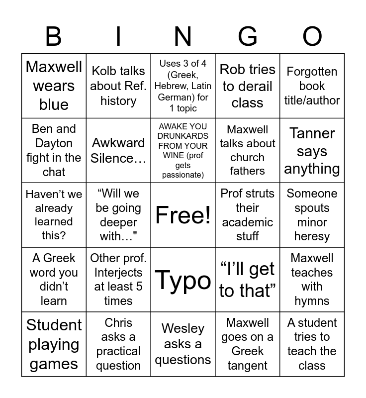 This bingo card has a free space and 28 words: Maxwell teaches with hymns, Cyril of Alexandria, Maxwell talks about church fathers, Maxwell goes on a Greek tangent, Ben and Dayton fight in the chat, Uses 3 of 4 (Greek, Hebrew, Latin German) for 1 topic, Kolb talks about Ref. history, A Greek word you didn’t learn, Prof struts their academic stuff, Student playing games, Haven’t we already learned this?, Rob tries to derail class, Chris asks a practical question, Wesley asks a questions, Tanner says anything, Creature v. Creation, Other prof. Interjects at least 5 times, Awkward Silence…, AWAKE YOU DRUNKARDS FROM YOUR WINE (prof gets passionate), Typo, Maxwell wears blue, Concurd, A student tries to teach the class, “Will we be going deeper with…", Someone spouts minor heresy, “I’ll get to that”, Forgotten book title/author and Chuck checks out (pic required).