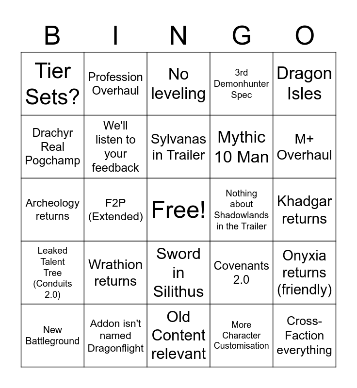 This bingo card has a free space and 36 words: New Race, New Class, Release Date, We'll listen to your feedback, Covenants 2.0, Leaked Talent Tree (Conduits 2.0), Sylvanas in Trailer, AP (Aspect Power), Dragon Isles, Housing, F2P (Extended), 3rd Demonhunter Spec, Teldrassil rebuilt, Nothing about Shadowlands in the Trailer, M+ Overhaul, Tier Sets?, (Class) Legendaries, Wrathion returns, Cross-Faction everything, No leveling, Khadgar returns, Onyxia returns (friendly), Addon isn't named Dragonflight, New Battleground, Old Content relevant, Profession Overhaul, Archeology returns, Cosmetic Wings for Collectors Ed., Mythic 10 Man, Drachyr Real Pogchamp, Remastering old Zones, They say "Among Us" (sussy baka), More Character Customisation, Sword in Silithus, Wotlk Release Announcement and Galakrond revived.