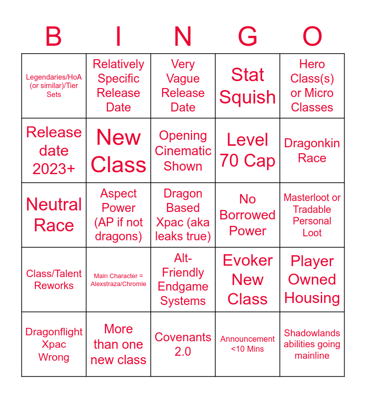 This bingo card has a free space and 24 words: Main Character = Alexstraza/Chromie, More than one new class, Opening Cinematic Shown, Dragonflight Xpac Wrong, Hero Class(s) or Micro Classes, Legendaries/HoA (or similar)/Tier Sets, Release date 2023+, Relatively Specific Release Date, No Borrowed Power, Alt-Friendly Endgame Systems, Level 70 Cap, Neutral Race, Evoker New Class, Player Owned Housing, New Class, Announcement <10 Mins, Masterloot or Tradable Personal Loot, Very Vague Release Date, Dragonkin Race, Aspect Power (AP if not dragons), Shadowlands abilities going mainline, Class/Talent Reworks, Stat Squish and Covenants 2.0.