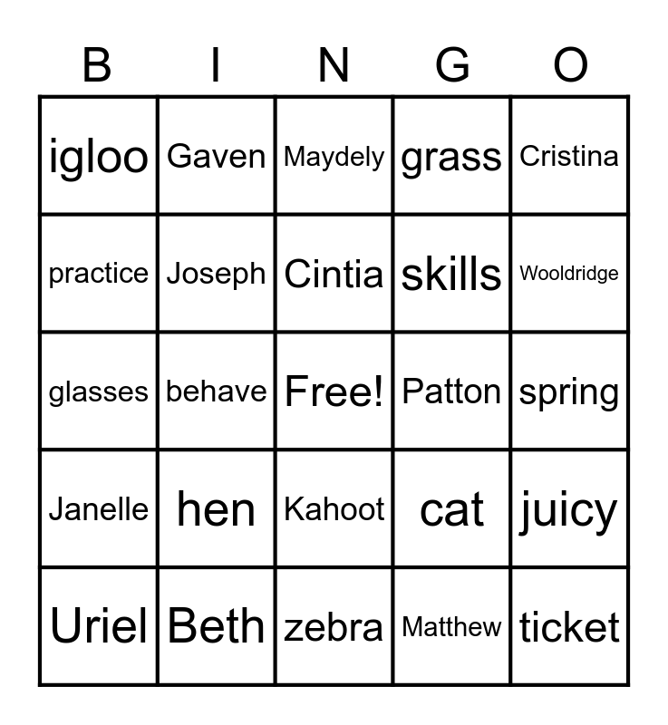 This bingo card has a free space and 34 words: Roman, Matthew, Zachary, Levi, Janelle, Joseph, Cristina, Uriel, Gaven, Bella, Cintia, Maydely, Collin, Gladys, Patton, Wooldridge, Beth, glasses, hen, cat, Kahoot, Juan, igloo, spring, zebra, ticket, grass, hexagon, skills, practice, under, behave, juicy and wave.