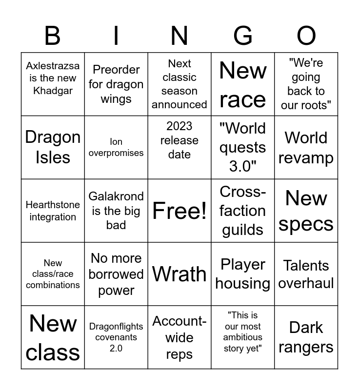 This bingo card has a free space and 24 words: No more borrowed power, Dragonflights covenants 2.0, 2023 release date, New class, "We're going back to our roots", Axlestrazsa is the new Khadgar, Dragon Isles, Preorder for dragon wings, Cross-faction guilds, Wrath, "World quests 3.0", Hearthstone integration, Player housing, Talents overhaul, Ion overpromises, "This is our most ambitious story yet", New specs, Next classic season announced, World revamp, Galakrond is the big bad, Dark rangers, New class/race combinations, New race and Account-wide reps.