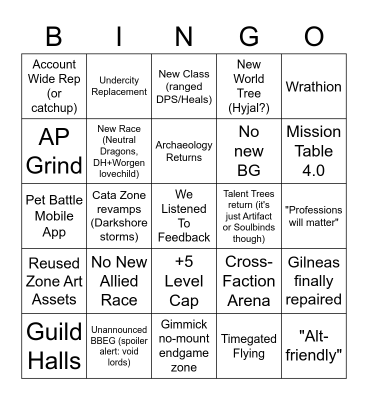 This bingo card has a free space and 29 words: Guild Halls, New Continent - Dragon Isles, Cata Zone revamps (Darkshore storms), TBC Zone revamps (Quel'thalas flying), Account Wide Rep (or catchup), New Class (ranged DPS/Heals), New Race (Neutral Dragons, DH+Worgen lovechild), No New Allied Race, Talent Trees return (it's just Artifact or Soulbinds though), Unannounced BBEG (spoiler alert: void lords), "Professions will matter", "Alt-friendly", Gimmick no-mount endgame zone, Timegated Flying, Mission Table 4.0, Dalaran as main hub, +5 Level Cap, Reused Zone Art Assets, Wrathion, Pet Battle Mobile App, Cross-Faction Arena, X'alatath, No new BG, AP Grind, New World Tree (Hyjal?), Undercity Replacement, Gilneas finally repaired, Archaeology Returns and Gear Slot reserved for xpac-specific item.