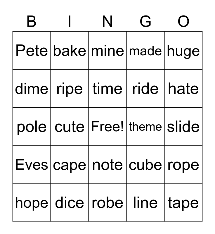 This bingo card has a free space and 39 words: use, rate, joke, ripe, hope, note, time, Steve, huge, Eves, cute, made, tape, slide, theme, cape, these, Pete, mule, cube, dime, robe, ride, hate, mute, prune, mute, lake, gate, bake, age, bike, mine, dice, line, tone, rope, pole and nose.