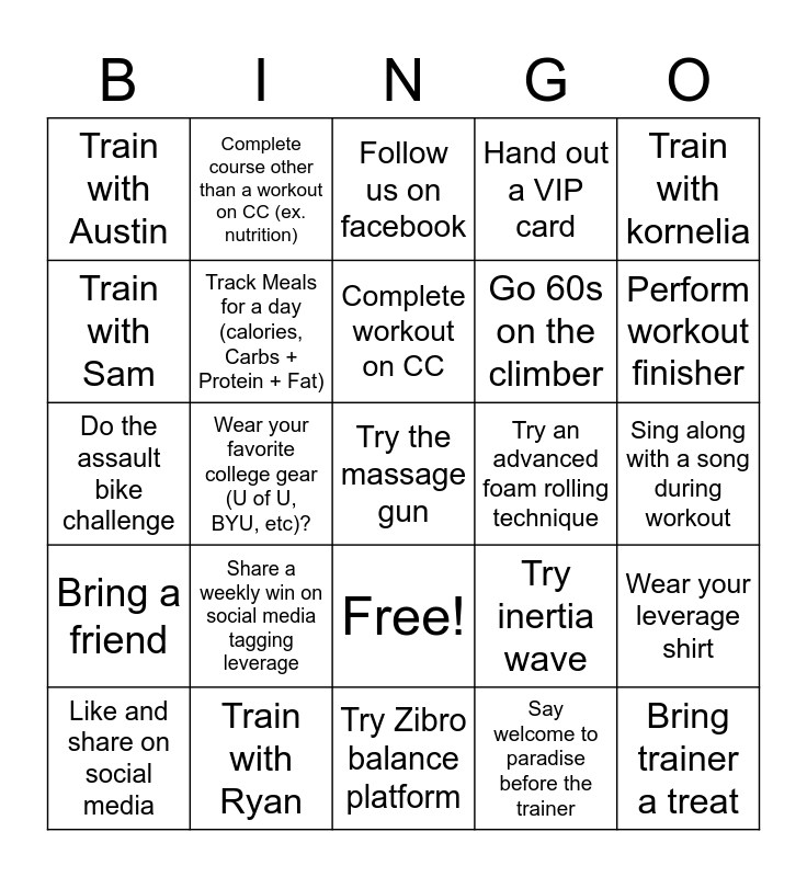 This bingo card has 26 words: Free!, Say welcome to paradise before the trainer, Complete workout on CC, Train with Ryan, Train with kornelia, Train with Austin, Train with Sam, Complete course other than a workout on CC (ex. nutrition), Sing along with a song during workout, Try inertia wave, Go 60s on the climber, Do the assault bike challenge, Wear your leverage shirt, Like and share on social media, Wear your favorite college gear (U of U, BYU, etc)?, Free Spot, Hand out a VIP card, Bring a friend, Follow us on facebook, Try the massage gun, Perform workout finisher, Try Zibro balance platform, Try an advanced foam rolling technique, Share a weekly win on social media tagging leverage, Track Meals for a day (calories, Carbs + Protein + Fat) and Bring trainer a treat.