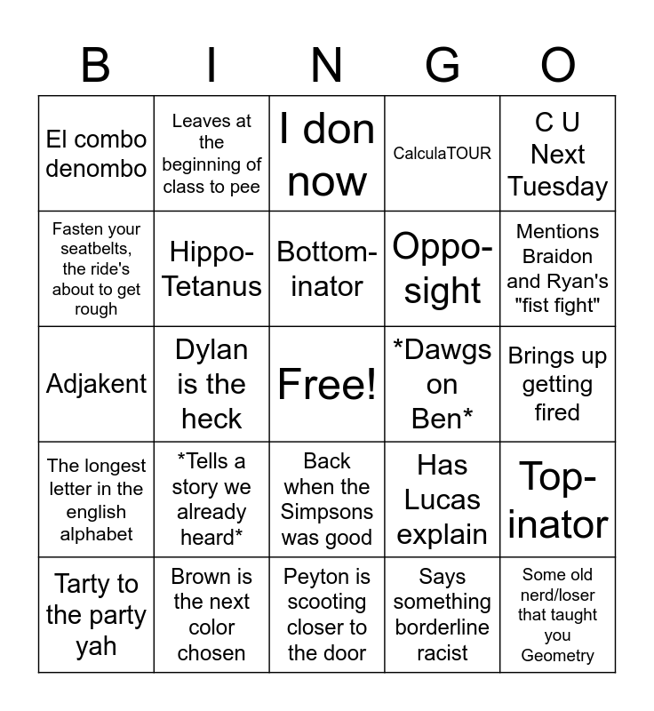 This bingo card has a free space and 29 words: Tarty to the party yah, Stop touching each other, Dylan is the heck, Are you positive?, El combo denombo, I don now, Hippo-Tetanus, *Tells a story we already heard*, *Dawgs on Ben*, Brown is the next color chosen, Brings up getting fired, Some old nerd/loser that taught you Geometry, Peyton is scooting closer to the door, Says something borderline racist, Mentions Braidon and Ryan's "fist fight", PyThAgOREEAN THEEOREM, Back when the Simpsons was good, The longest letter in the english alphabet, C U Next Tuesday, Adjakent, Has Lucas explain, It lies to you!, Oppo-sight, Fasten your seatbelts, the ride's about to get rough, CalculaTOUR, Leaves at the beginning of class to pee, Top-inator, Bottom-inator and You Do You, Boo-Boo.
