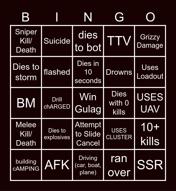 This bingo card has a free space and 24 words: Dies to explosives, AFK, Dies in 10 seconds, building cAMPING, Grizzy Damage, Sniper Kill/ Death, Dies to storm, Suicide, Dies with 0 kills, Attempt to Slide Cancel, Drowns, BM, USES CLUSTER, 10+ kills, flashed, ran over, USES UAV, dies to bot, Uses Loadout, Drill chARGED, SSR, Melee Kill/ Death, TTV and Driving (car, boat, plane).