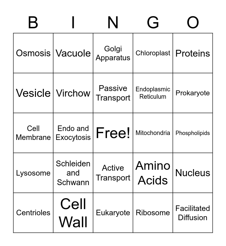 This bingo card has a free space and 28 words: Nucleus, Nucleolus, Endoplasmic Reticulum, Ribosome, Vesicle, Golgi Apparatus, Vacuole, Lysosome, Mitochondria, Centrioles, Cell Membrane, Chloroplast, Cell Wall, Eukaryote, Prokaryote, Hooke, Schleiden and Schwann, Virchow, Passive Transport, Active Transport, Osmosis, Diffusion, Facilitated Diffusion, Endo and Exocytosis, Phospholipids, Amino Acids, Proteins and DNA.