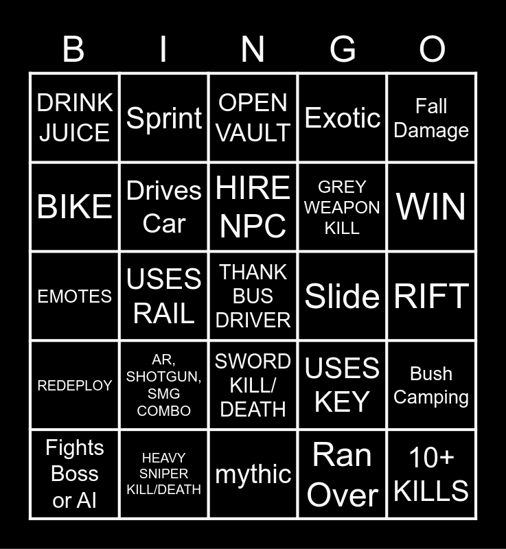 This bingo card has a free space and 24 words: AR, SHOTGUN, SMG COMBO, HEAVY SNIPER KILL/DEATH, HIRE NPC, Fights Boss or AI, Fall Damage, DRINK JUICE, BIKE, Sprint, Slide, SWORD KILL/ DEATH, GREY WEAPON KILL, EMOTES, USES KEY, Bush Camping, Drives Car, Ran Over, RIFT, OPEN VAULT, WIN, USES RAIL, 10+ KILLS, REDEPLOY, Exotic and mythic.