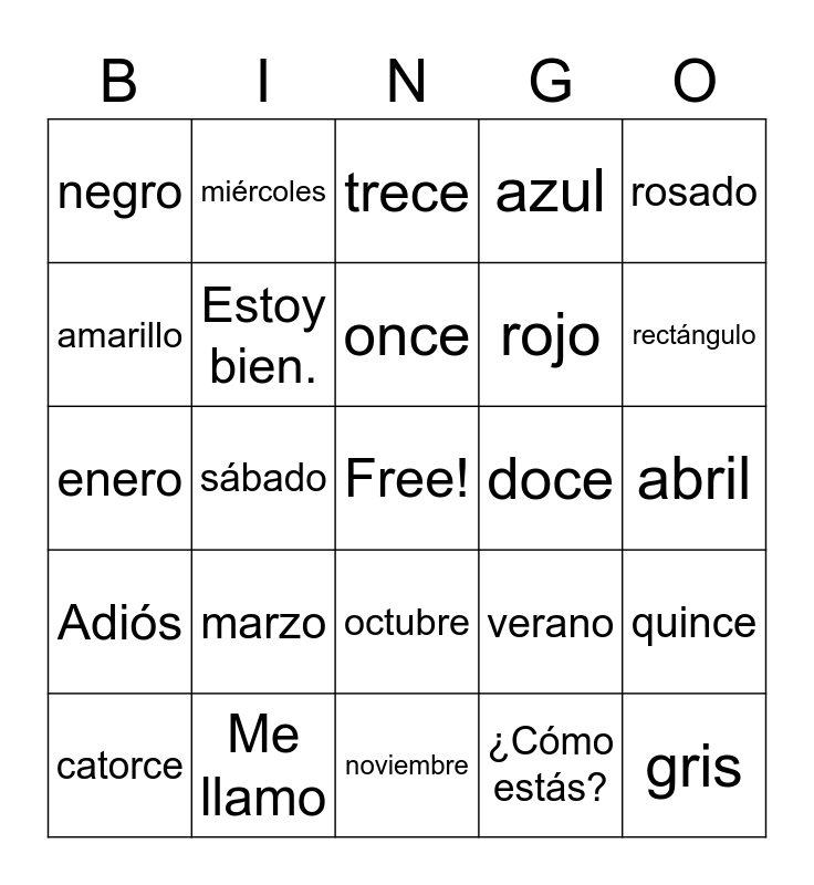 This bingo card has a free space and 59 words: ¿Cómo te llamas?, Me llamo, Hola, Adiós, ¿Cómo estás?, Estoy feliz., Estoy bien., Estoy triste., rojo, anaranjado, azul, verde, amarillo, morado, blanco, negro, gris, rosado, café, once, doce, trece, catorce, quince, veinte, círculo, cuadrado, tríangulo, rectángulo, óvalo, estrella, diamante/rombo, lunes, martes, miércoles, jueves, viernes, sábado, domingo, enero, febrero, marzo, abril, mayo, junio, julio, agosto, septiembre, octubre, noviembre, diciembre, año, día, estación, primavera, verano, invierno, otoño and Hace calor..