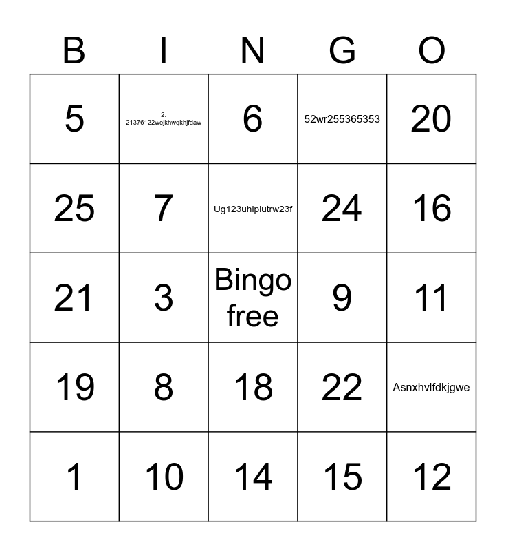 This bingo card has a free space and 29 words: 1, 2, 3, 4, 5, 6, 7, 8, 9, 10, 11, 12, 14, 15, 16, 17, 18, 19, 20, 21, 22, 23, 24, 25, 52wr255365353, 2. 21376122wejkhwqkhjfdaw, Asnxhvlfdkjgwe, Ug123uhipiutrw23f and Qweryoguqwyr.