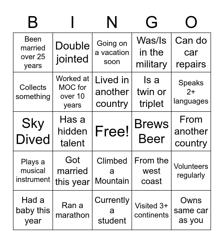 This bingo card has a free space and 29 words: Had a baby this year, Has a Masters, Has a hidden talent, Married their high school sweetheart, Been married over 25 years, Going on a vacation soon, Worked at MOC for over 10 years, Got married this year, Brews Beer, Ran a marathon, From another country, Owns same car as you, Currently a student, Visited 3+ continents, Speaks 2+ languages, Traveled in the last year, Climbed a Mountain, Plays a musical instrument, Can do car repairs, Sky Dived, From the west coast, Has a tattoo, Is a twin or triplet, Collects something, Was/Is in the military, Double jointed, Volunteers regularly, Lived in another country and Has an unusual hobby.