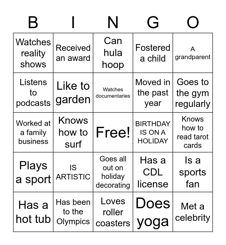 This bingo card has a free space and 29 words: Has a hot tub, Went viral on line, Knows how to surf, Likes anchovies, Watches reality shows, Can hula hoop, Like to garden, IS ARTISTIC, BIRTHDAY IS ON A HOLIDAY, Has been to the Olympics, Knows how to read tarot cards, Met a celebrity, Loves roller coasters, Does yoga, Goes to the gym regularly, Belongs to a club, Goes all out on holiday decorating, Plays a sport, A grandparent, Worked at a family business, Has a CDL license, Was in a wedding this year, Moved in the past year, Listens to podcasts, Fostered a child, Received an award, Is a sports fan, Watches documentaries and Has a part-time job.