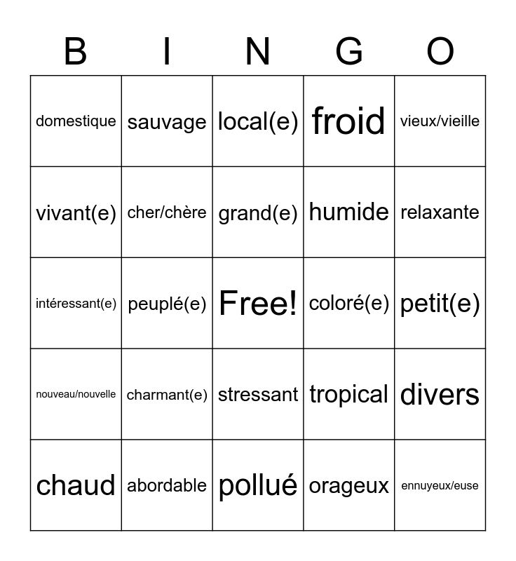 This bingo card has a free space and 24 words: charmant(e), abordable, grand(e), chaud, vieux/vieille, domestique, vivant(e), sauvage, coloré(e), stressant, humide, intéressant(e), tropical, divers, cher/chère, orageux, petit(e), local(e), relaxante, peuplé(e), ennuyeux/euse, nouveau/nouvelle, froid and pollué.