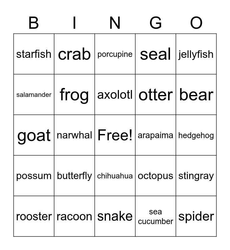 This bingo card has a free space and 49 words: bee, spider, worm, snake, butterfly, crocodile, crab, bass, salamander, shark, frog, seal, stingray, octopus, lobster, whale, axolotl, arapaima, sea urchin, jellyfish, narwhal, sea cucumber, starfish, otter, dinosaur, bear, rooster, gorilla, chihuahua, possum, moose, sheep, elephant, badger, racoon, kangaroo, lemur, squirrel, hedgehog, pig, fox, donkey, monkey, jerboa, goat, porcupine, bat, penguin and eagle.