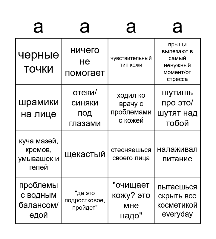 This bingo card has 16 words: "да это подростковое, пройдет", налаживал питание, чувствительный тип кожи, черные точки, куча мазей, кремов, умывашек и гелей, ничего не помогает, стесняешься своего лица, "очищает кожу? это мне надо", шрамики на лице, отеки/синяки под глазами, проблемы с водным балансом/едой, прыщи вылезают в самый ненужный момент/от стресса, щекастый, шутишь про это/шутят над тобой, ходил ко врачу с проблемами с кожей and пытаешься скрыть все косметикой everyday.