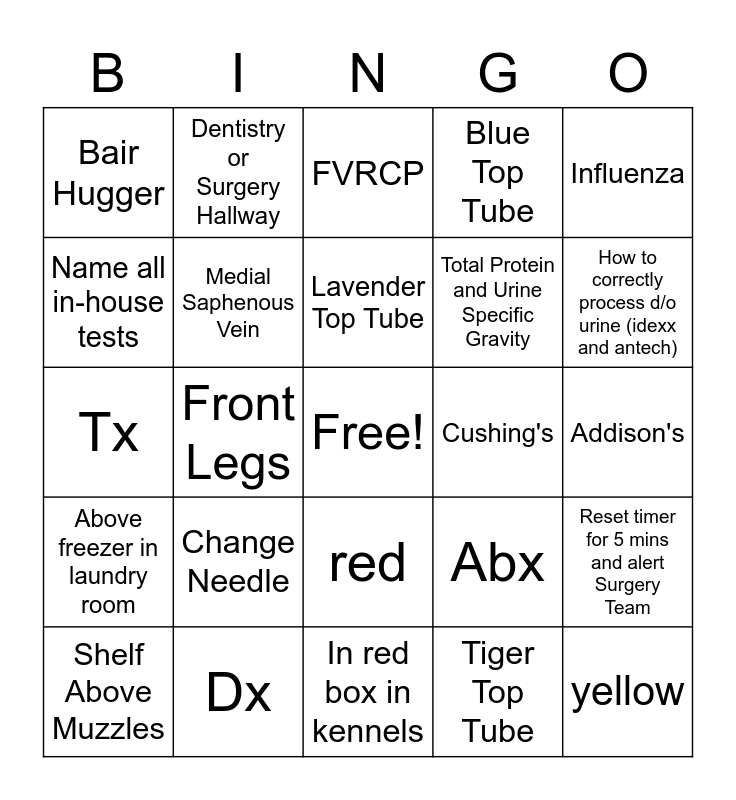 This bingo card has a free space and 24 words: Shelf Above Muzzles, Change Needle, Lavender Top Tube, Tiger Top Tube, Influenza, Bair Hugger, Dentistry or Surgery Hallway, FVRCP, Cushing's, Addison's, Tx, Medial Saphenous Vein, Abx, Reset timer for 5 mins and alert Surgery Team, Name all in-house tests, Dx, In red box in kennels, Blue Top Tube, How to correctly process d/o urine (idexx and antech), Above freezer in laundry room, Front Legs, red, Total Protein and Urine Specific Gravity and yellow.