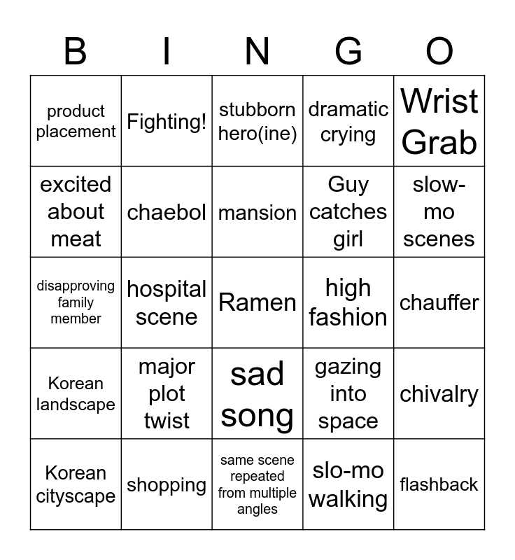 This bingo card has a free space and 24 words: major plot twist, shopping, mansion, Korean cityscape, Wrist Grab, product placement, excited about meat, Fighting!, high fashion, sad song, Guy catches girl, disapproving family member, gazing into space, chivalry, chaebol, slo-mo walking, chauffer, stubborn hero(ine), slow-mo scenes, hospital scene, flashback, Korean landscape, dramatic crying and same scene repeated from multiple angles.
