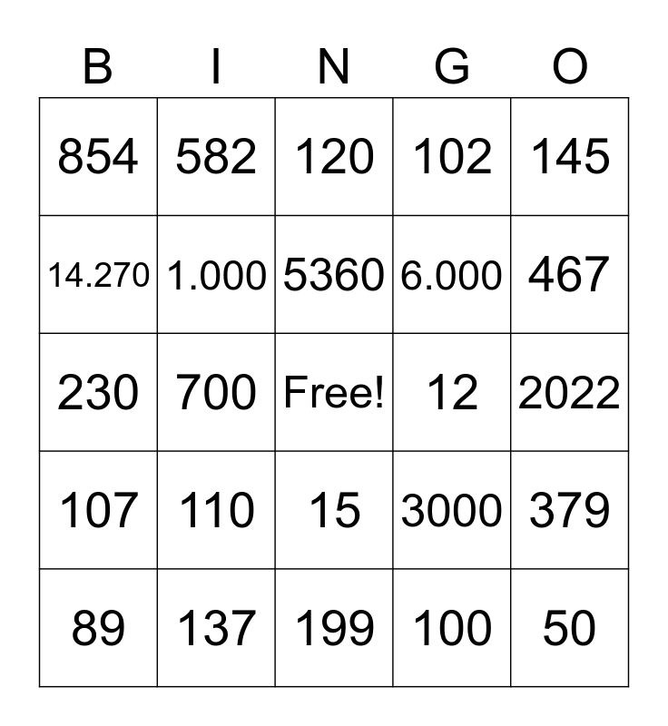 This bingo card has a free space and 45 words: 62, 50, 77, 89, 91, 100, 120, 114, 145, 137, 102, 12, 15, 110, 173, 199, 200, 230, 343, 467, 582, 613, 798, 854, 972, 2022, 1998, 2004, 3000, 107, 219, 379, 432, 543, 698, 700, 885, 919, 13, 5360, 14.270, 6.000, 20.000, 1.000 and 1.000.000.
