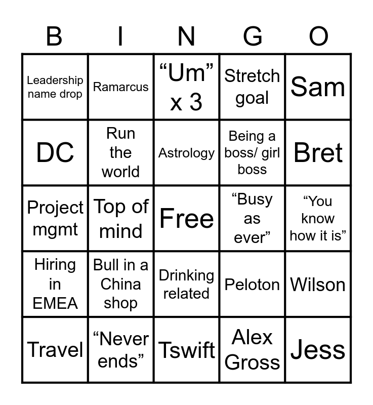 This bingo card has a free space and 24 words: Bull in a China shop, “Never ends”, Astrology, Travel, Sam, Leadership name drop, DC, Ramarcus, “Busy as ever”, Drinking related, Being a boss/ girl boss, Project mgmt, Peloton, Wilson, Run the world, Alex Gross, “You know how it is”, “Um” x 3, Bret, Top of mind, Jess, Hiring in EMEA, Stretch goal and Tswift.