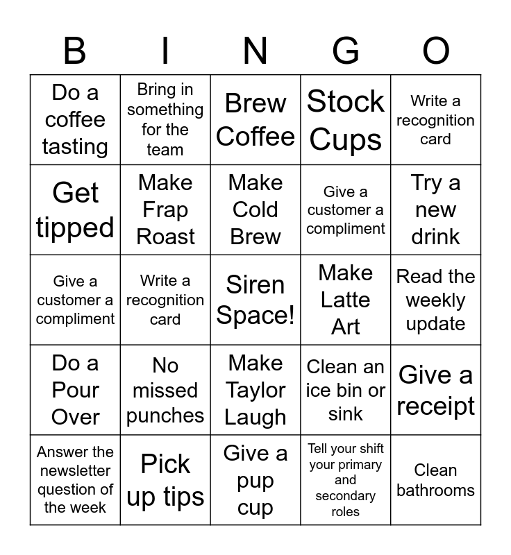 This bingo card has a free space and 29 words: Clean an Oven, Pick up tips, Brew Coffee, Restock a fridge, Write a recognition card, Do a coffee tasting, Make Frap Roast, Make Cold Brew, Make Latte Art, Give a receipt, Answer the newsletter question of the week, Write a recognition card, Tell your shift your primary and secondary roles, Clean bathrooms, Give a customer a compliment, Sign off on till audit, Give a pup cup, Clean an ice bin or sink, Try a new drink, Do a Pour Over, No missed punches, Make sweet cream, Give a customer a compliment, Read the weekly update, Get tipped, Bring in something for the team, Make Taylor Laugh, Stock Cups and Stock lids.