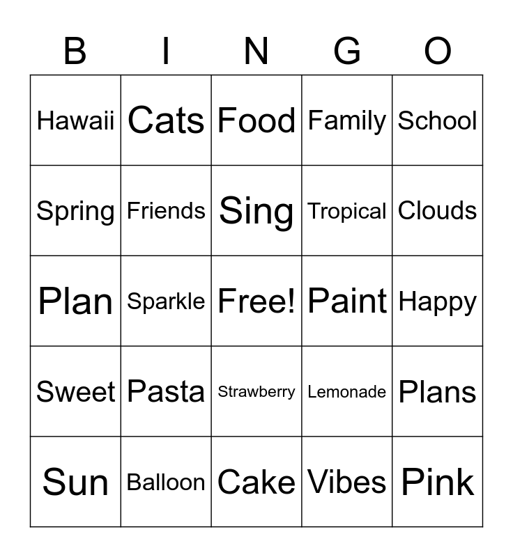 This bingo card has a free space and 49 words: Flowers, Pink, Party, Cake, Pasta, Plants, Cats, Beach, Spring, Summer, Friends, Family, Plans, Lemonade, Sunset, Dance, Sing, Paint, Art, School, Sparkle, Vibes, Hawaii, Tropical, Waves, Clouds, Sun, Sky, Strawberry, Sweet, Dream, Shop, Candles, Lily, Balloon, Music, Bingo, Laugh, Happy, Smile, Travel, Movie, Adventure, Love, Plan, Food, Princess, Hugs and Style.