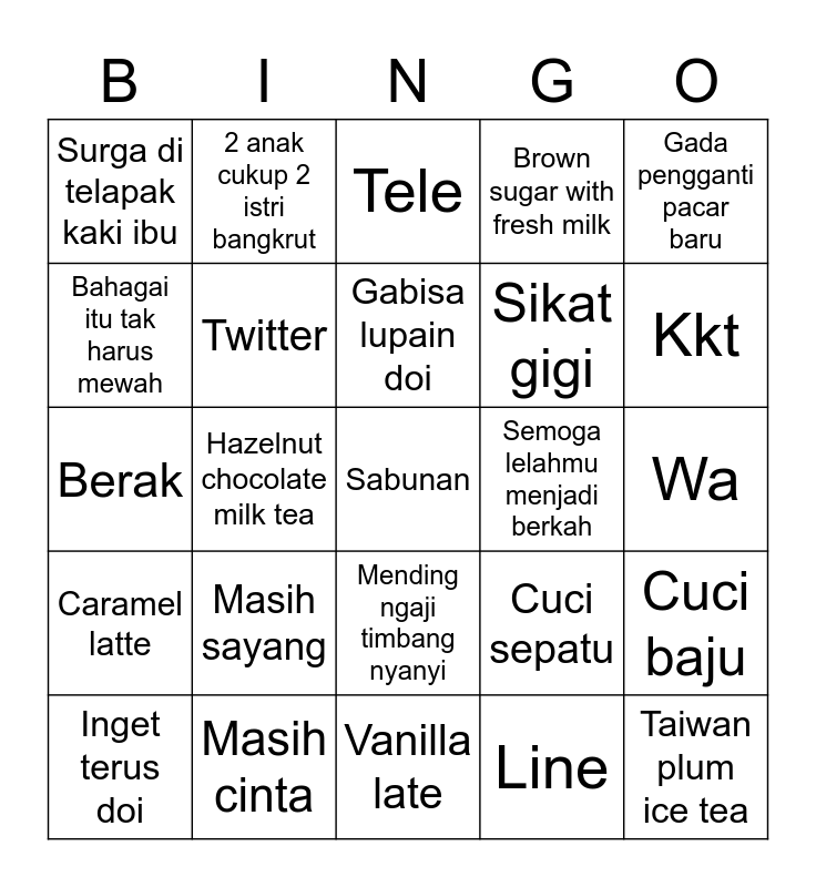 This bingo card has a free space and 24 words: Masih sayang, Masih cinta, Gabisa lupain doi, Inget terus doi, Gada pengganti pacar baru, Surga di telapak kaki ibu, Bahagai itu tak harus mewah, 2 anak cukup 2 istri bangkrut, Semoga lelahmu menjadi berkah, Mending ngaji timbang nyanyi, Sikat gigi, Berak, Cuci sepatu, Cuci baju, Twitter, Line, Wa, Tele, Kkt, Hazelnut chocolate milk tea, Taiwan plum ice tea, Caramel latte, Brown sugar with fresh milk and Vanilla late.