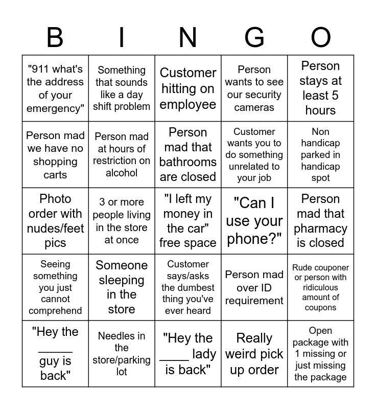 This bingo card has a free space and 24 words: Someone sleeping in the store, Needles in the store/parking lot, Person mad that bathrooms are closed, "Hey the _____ guy is back", Person stays at least 5 hours, "911 what's the address of your emergency", Person mad we have no shopping carts, Something that sounds like a day shift problem, "Can I use your phone?", Customer says/asks the dumbest thing you've ever heard, Customer wants you to do something unrelated to your job, Photo order with nudes/feet pics, Person mad over ID requirement, Rude couponer or person with ridiculous amount of coupons, Person mad at hours of restriction on alcohol, Really weird pick up order, Person mad that pharmacy is closed, Customer hitting on employee, Non handicap parked in handicap spot, 3 or more people living in the store at once, Open package with 1 missing or just missing the package, Seeing something you just cannot comprehend, Person wants to see our security cameras and "Hey the ____ lady is back".