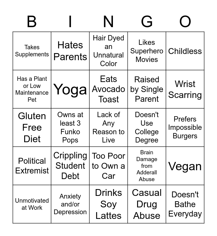 This bingo card has a free space and 24 words: Crippling Student Debt, Anxiety and/or Depression, Eats Avocado Toast, Unmotivated at Work, Childless, Takes Supplements, Has a Plant or Low Maintenance Pet, Hates Parents, Doesn't Use College Degree, Too Poor to Own a Car, Raised by Single Parent, Gluten Free Diet, Brain Damage from Adderall Abuse, Vegan, Yoga, Casual Drug Abuse, Prefers Impossible Burgers, Hair Dyed an Unnatural Color, Wrist Scarring, Owns at least 3 Funko Pops, Doesn't Bathe Everyday, Political Extremist, Likes Superhero Movies and Drinks Soy Lattes.