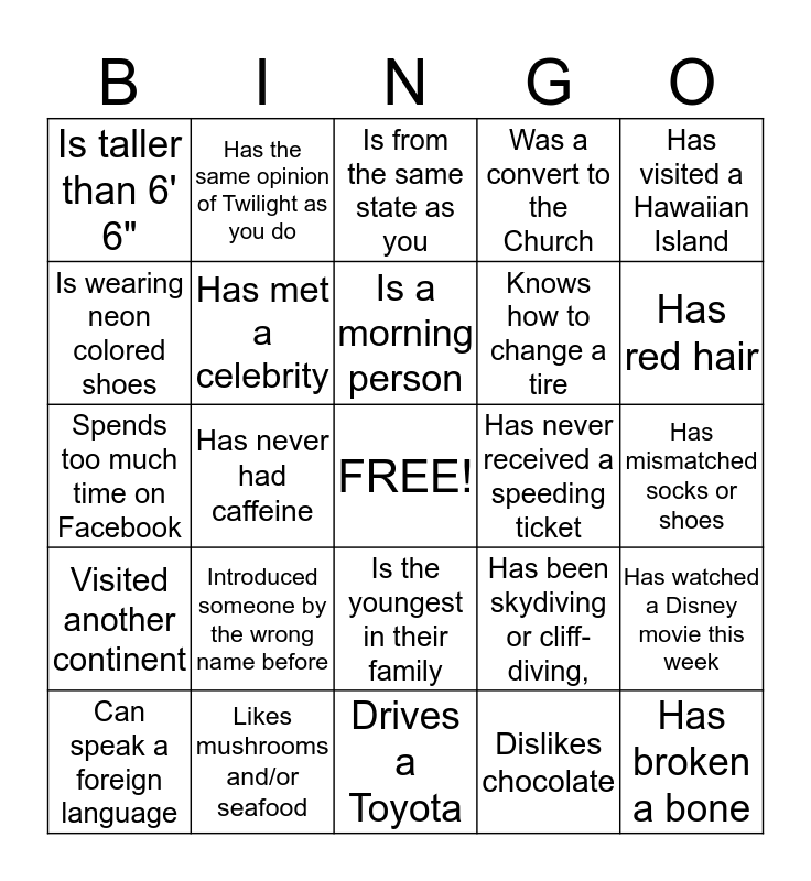 This bingo card has a free space and 43 words: Is in the same major (or a similar one) as you, Has broken a bone, Can play a musical instrument, Can speak a foreign language, Can do a back-flip, Dislikes chocolate, Is from the same state as you, Has 2 or more pets at home, Has visited a Hawaiian Island, Likes mushrooms and/or seafood, Was a convert to the Church, Has never received a speeding ticket, Is the youngest in their family, Introduced someone by the wrong name before, Is afraid of spiders, Drives a Toyota, Likes Mexican food, Spends too much time on Facebook, Played a sport in school, Has red hair, Has the same opinion of Twilight as you do, Has the same color of eyes as you, Graduated high school in the same year as you, Is taller than 6' 6", Is in a nursing program, Has mismatched socks or shoes, Has the same favorite cereal as you, Has never ridden a bike, Has been skydiving or cliff-diving,, Visited another continent, Doesn't know how to swim, Has watched a Disney movie this week, Is wearing the same color shirt as you, Has never had caffeine, Has the same favorite BoM story as you, Name starts with an “M", Is registered for a chemistry class, Is a morning person, Is wearing neon colored shoes, Knows how to change a tire, Has been to Disneyland more than three times, Has met a celebrity and Has met a General Authority.