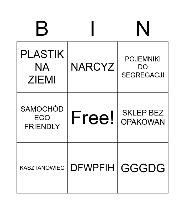 This bingo card has a free space and 9 words: KASZTANOWIEC, POJEMNIKI DO SEGREGACJI, NARCYZ, SAMOCHÓD ECO FRIENDLY, PLASTIK NA ZIEMI, SKLEP BEZ OPAKOWAŃ, GGGDG, QOWDHŮWIH and DFWPFIH.
