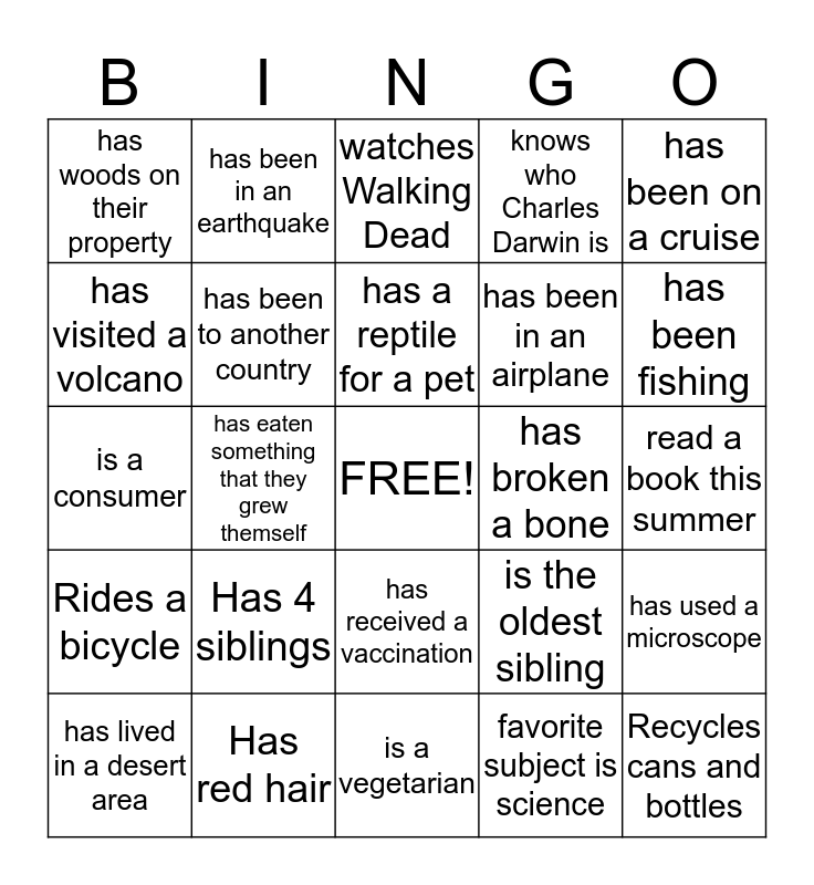 This bingo card has a free space and 24 words: Has 4 siblings, Has red hair, has a reptile for a pet, has lived in a desert area, has been on a cruise, has woods on their property, has visited a volcano, has been in an earthquake, has broken a bone, has received a vaccination, has been in an airplane, is a consumer, is the oldest sibling, has used a microscope, has been to another country, favorite subject is science, read a book this summer, watches Walking Dead, has been fishing, has eaten something that they grew themself, Recycles cans and bottles, Rides a bicycle, knows who Charles Darwin is and is a vegetarian.