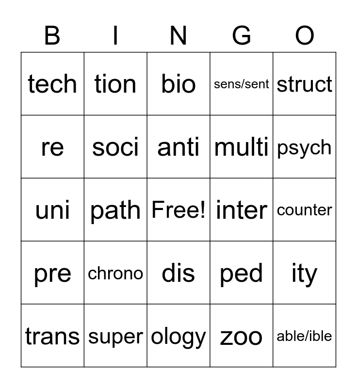 This bingo card has a free space and 29 words: trans, sub, path, syn, tech, bio, soci, chrono, inter, super, counter, able/ible, ology, zoo, psych, tri, dis, pre, struct, uni, ped, ist, multi, re, sens/sent, tion, ity, anti and ex.