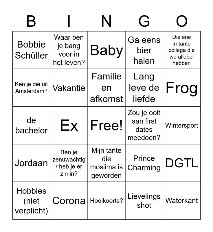 This bingo card has a free space and 25 words: Ben je zenuwachtig / heb je er zin in?, Hooikoorts?, Familie en afkomst, Hobbies (niet verplicht), Die ene irritante collega die we allebei hebben, Bobbie Schüller, Ken je die uit Amsterdam?, Waar ben je bang voor in het leven?, Zou je ooit aan first dates meedoen?, Mijn tante die moslima is geworden, Lang leve de liefde, de bachelor, Prince Charming, DGTL, Vakantie, Pasen, Wintersport, Baby, Frog, Ex, Waterkant, Corona, Jordaan, Ga eens bier halen and Lievelings shot.